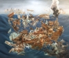 I am moving into the later layers on this painting of the Durande. Here the sea is more noticeably the antagonist. The high horizon line suggests dominance over vessel. I cut out the higher key turquoise color of the sea for a more somber grey blue. Now that I think of it, I can't remember Victor Hugo describing the hue of the open ocean.